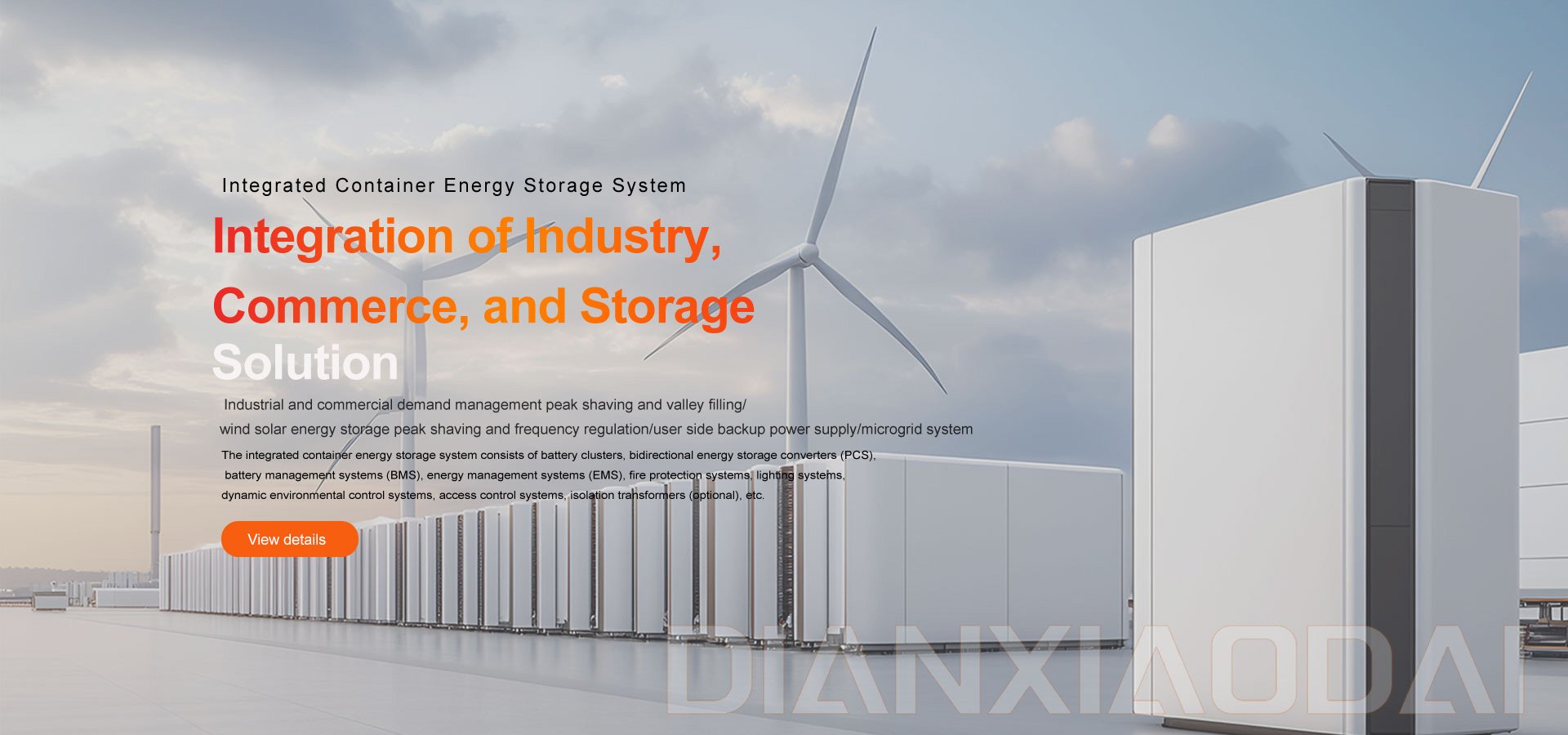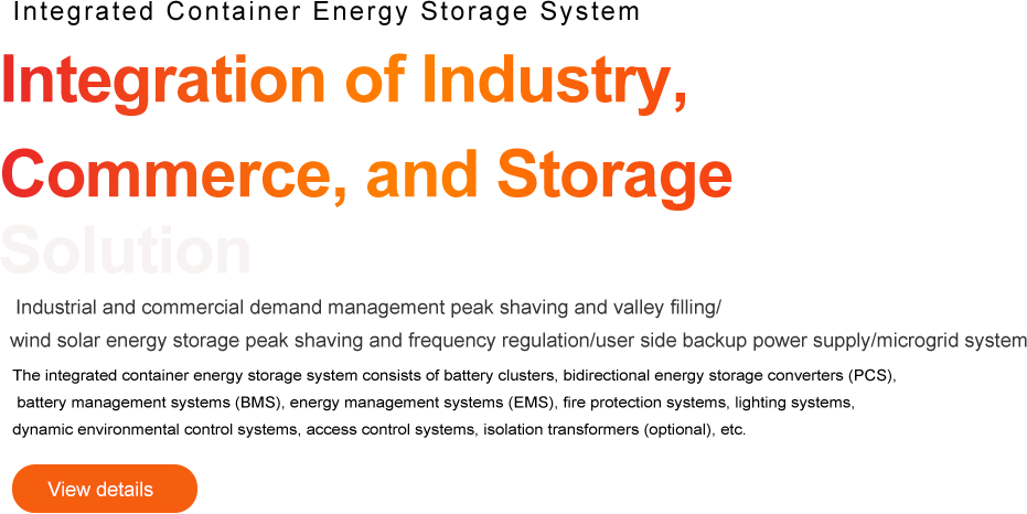 The integrated container energy storage system consists of battery clusters, bidirectional energy storage converters (PCS), battery management systems (BMS), energy management systems (EMS), fire protection systems, lighting systems, dynamic environmental control systems, access control systems, isolation transformers (optional), etc.
